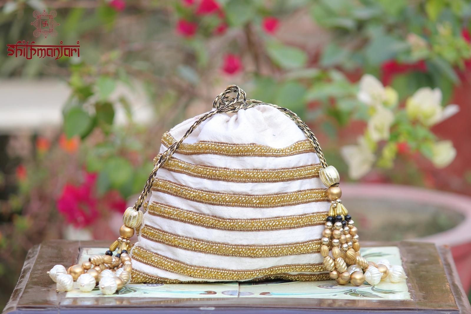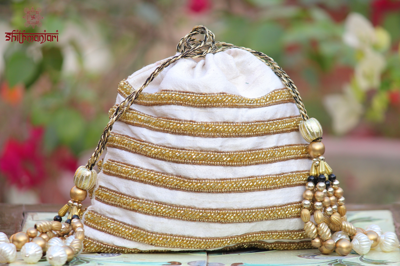 Elegant and timeless, this cream fabric potli bag is a true reflection of traditional craftsmanship blended with modern luxury. Designed with a soft, premium base, it is beautifully adorned with intricate antique gold embroidery that forms graceful horizontal patterns, adding depth and richness to its overall appeal. The delicate detailing showcases skilled artistry, making it a standout accessory for special occasions.