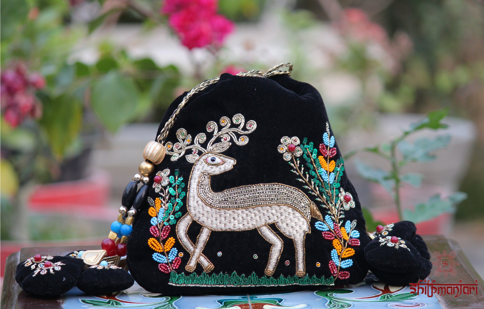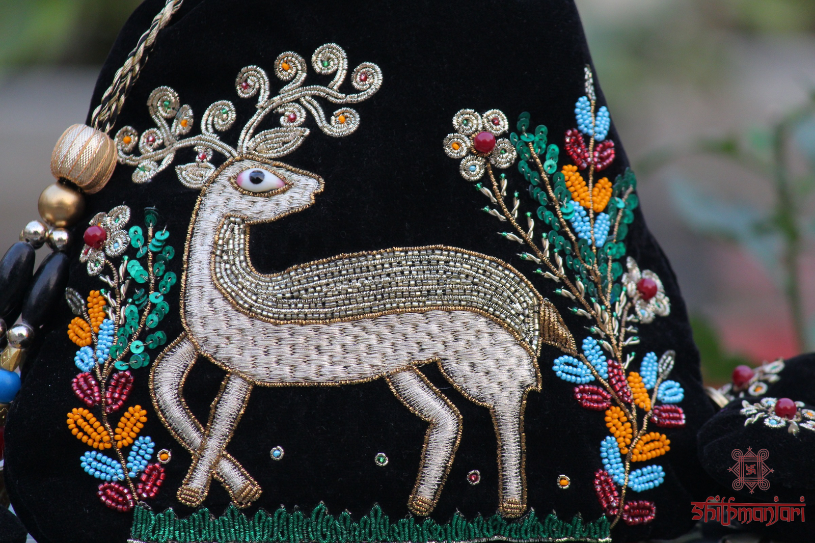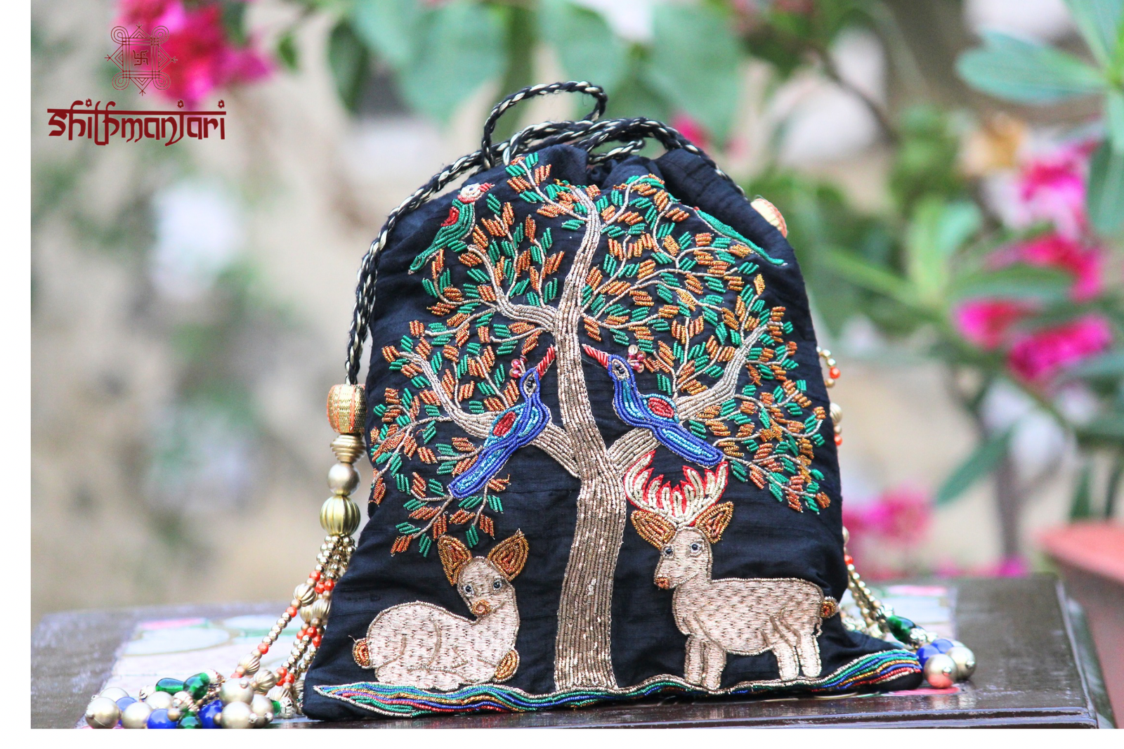 Make a bold ethnic statement with this luxurious handcrafted potli bag, featuring exquisite embroidery of peacocks, deer, and a detailed tree motif. Crafted on a rich black fabric base, the colorful threadwork and fine bead detailing bring the design to life with a royal and artistic touch.