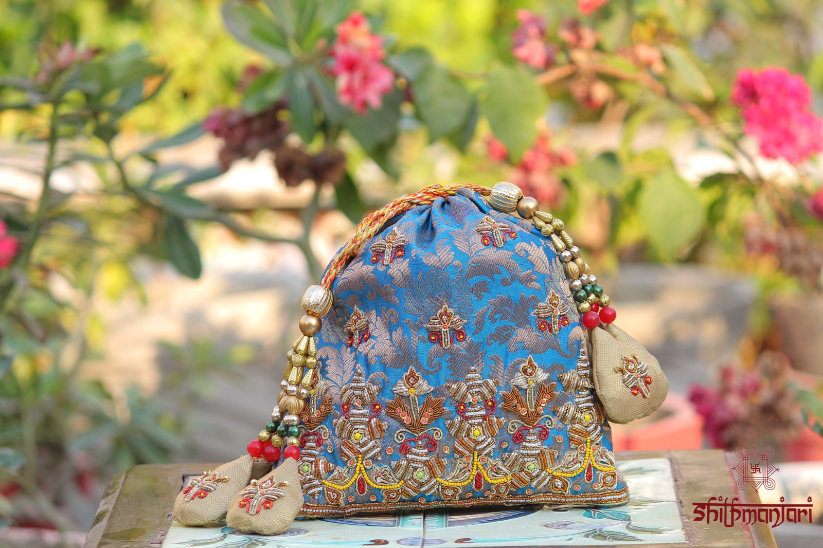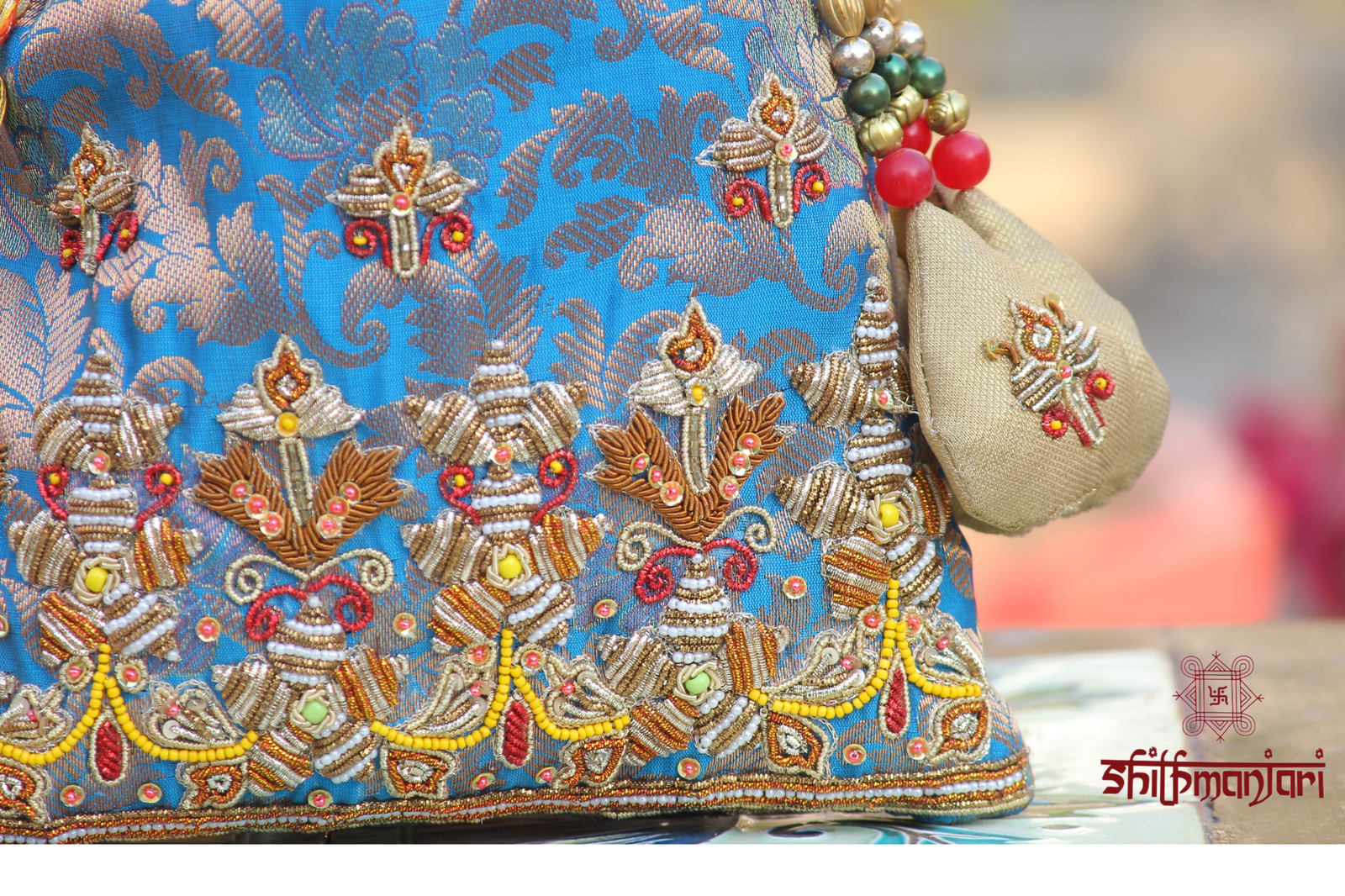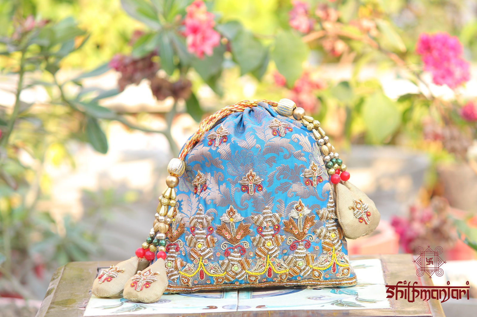 Add a refreshing touch of elegance to your ethnic collection with this luxurious sky blue brocade potli bag, beautifully crafted with intricate detailing and traditional artistry. The rich brocade fabric features woven patterns that enhance its regal appeal, while delicate zari embroidery adds a subtle golden shimmer for a sophisticated finish. Accented with vibrant multicolor bead tassels and handcrafted embellishments, this bag exudes festive charm and timeless beauty.