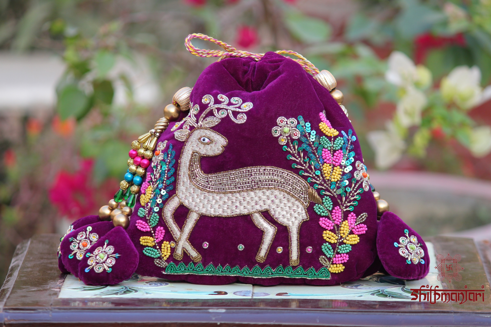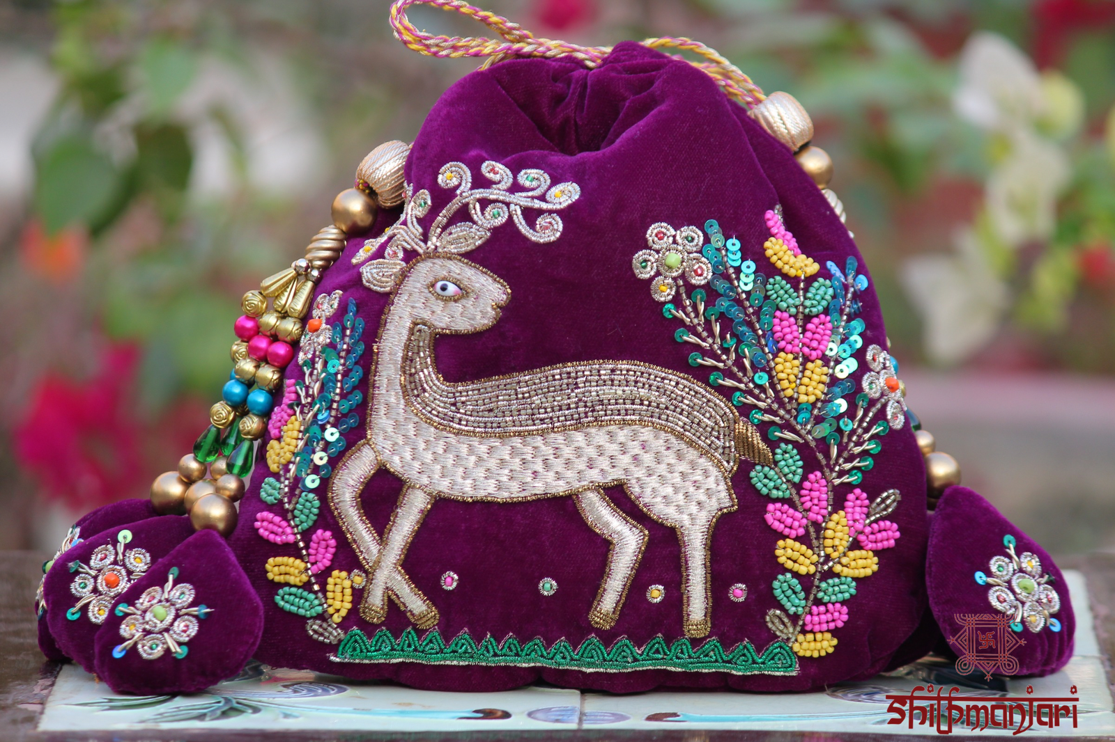 Luxury Velvet Deer Embroidered Potli Bag with Beads & Sequin Work (Handcrafted Designer Ethnic Clutch)