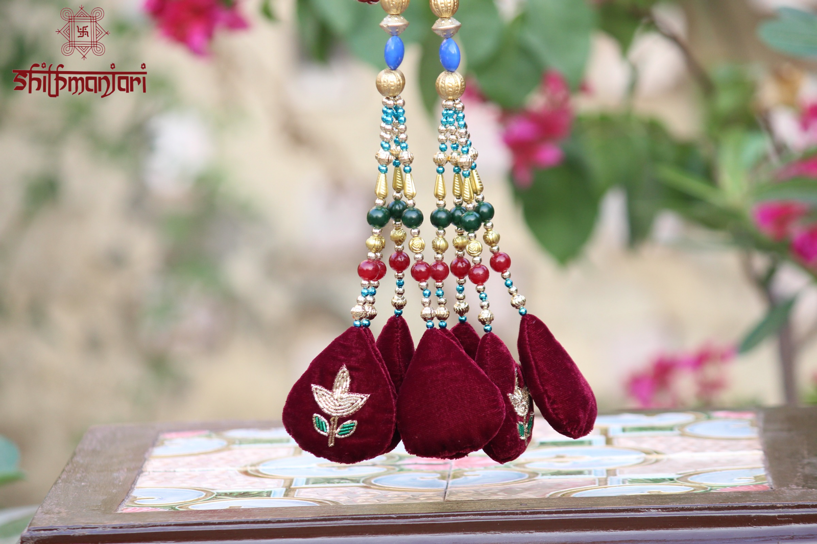 The highlight of this piece lies in its soft velvet petal tassels, intricately crafted to resemble delicate floral drops. These plush elements are further elevated with fine zari detailing, adding a subtle shimmer and a touch of regal sophistication. The layered beadwork above the tassels creates graceful movement, giving the accessory a luxurious and eye-catching appeal.