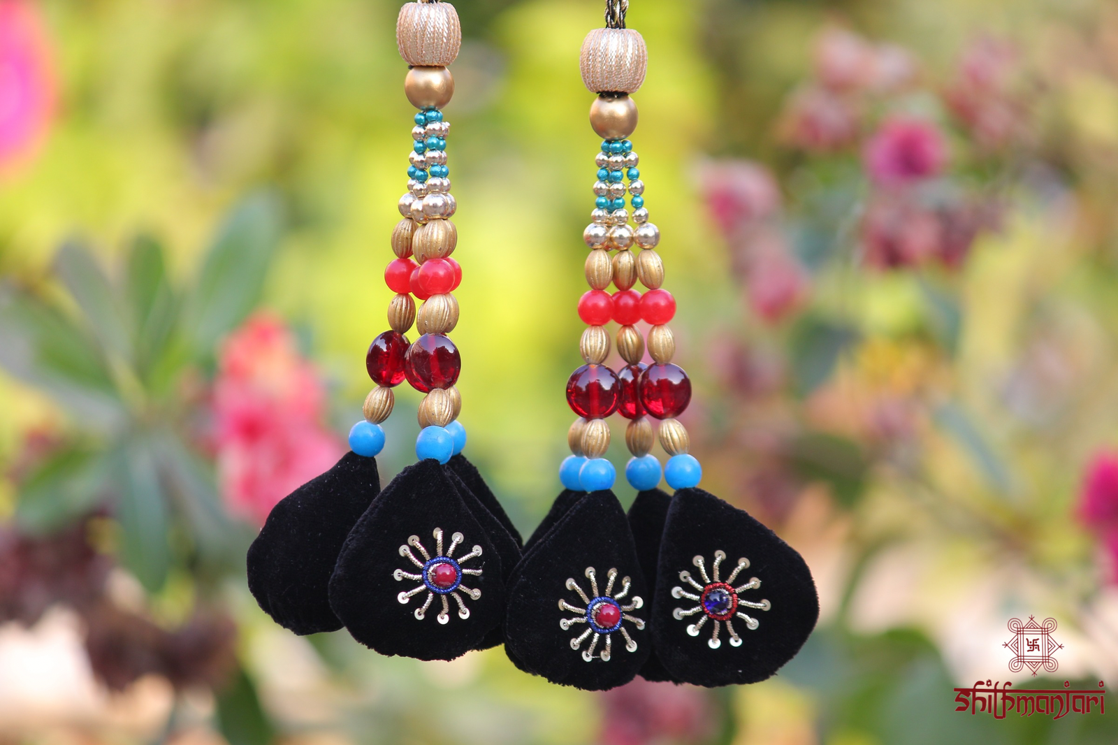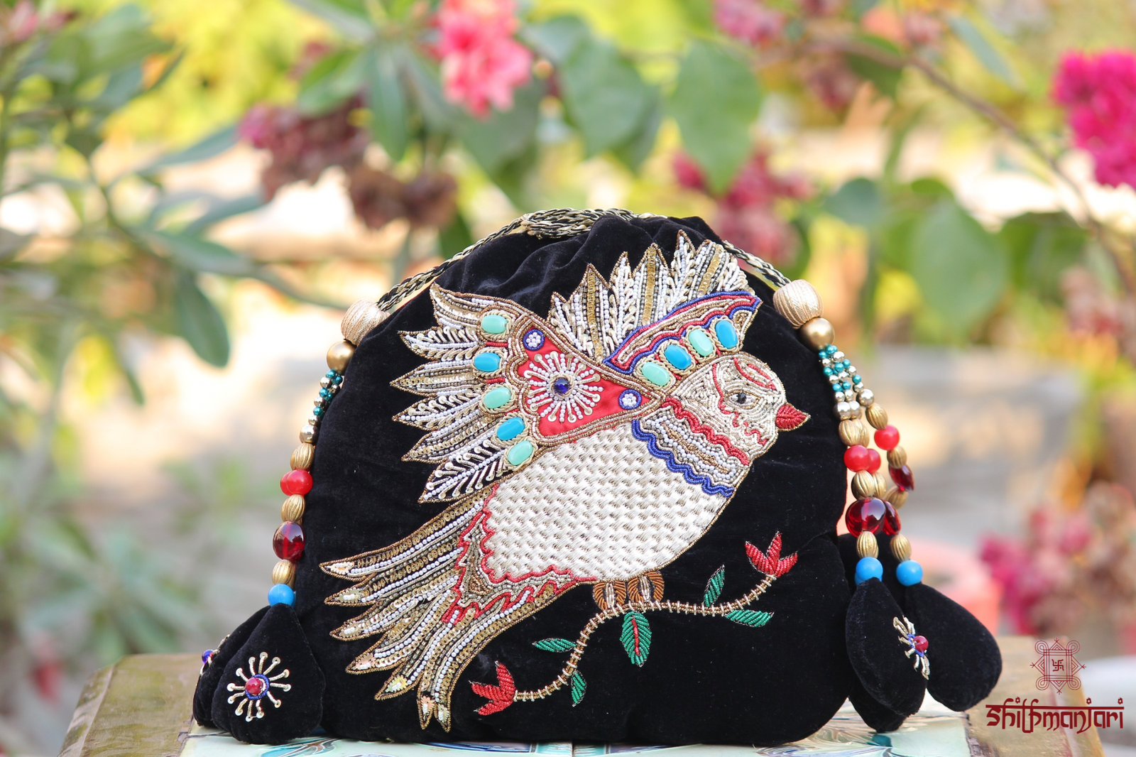 Every element of this clutch reflects skilled craftsmanship—from the layered embellishments to the vibrant bead detailing along the drawstrings, adding both texture and movement. The soft yet structured silhouette makes it easy to carry, while the spacious interior ensures you can keep your essentials close in style.
