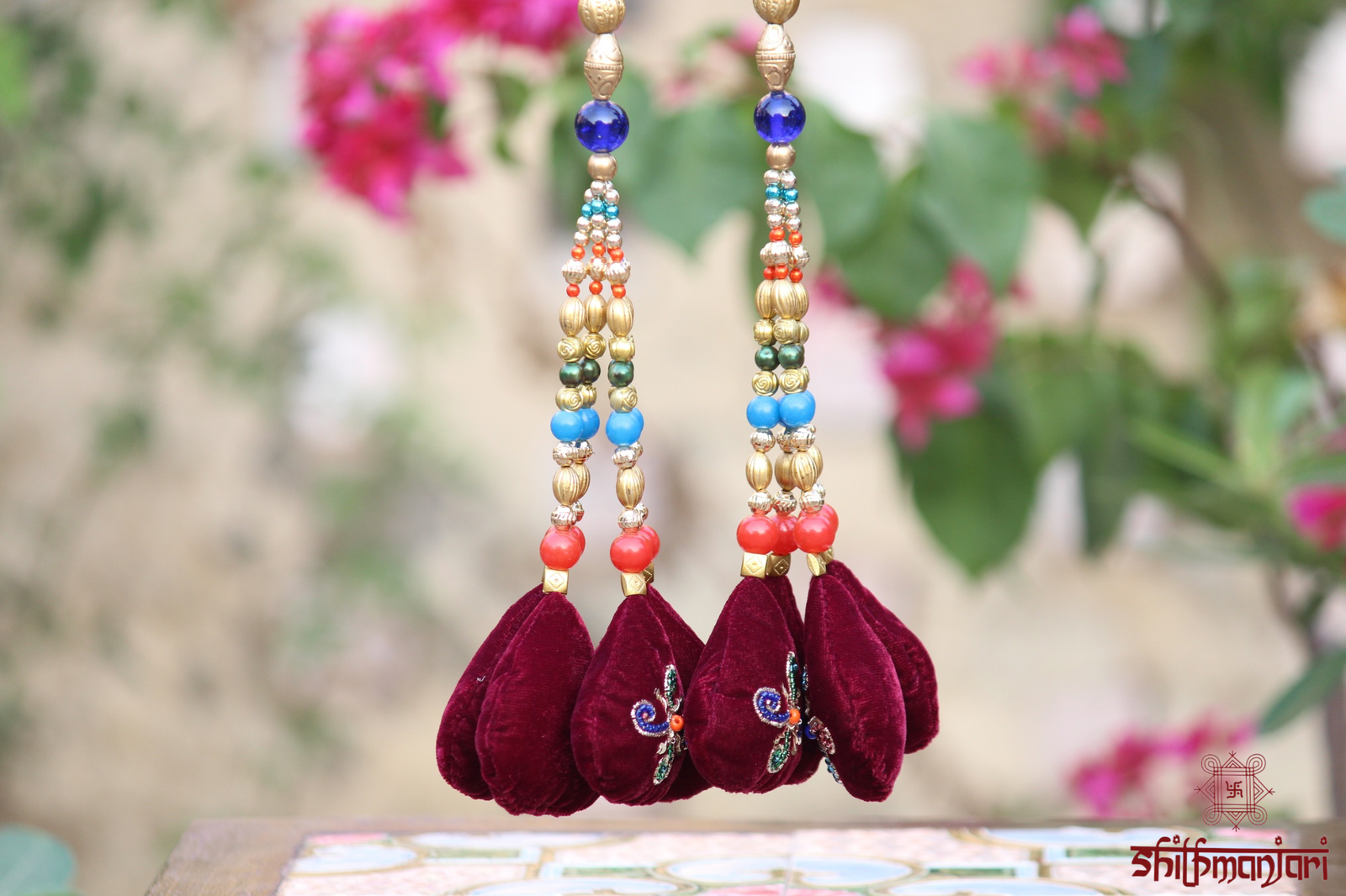 The detailed embroidery is enhanced with multicolor bead and stone embellishments, adding depth, texture, and a vibrant festive charm. Each element is thoughtfully designed to reflect fine craftsmanship, while the soft velvet base gives it a plush and opulent feel. The potli is further adorned with decorative bead tassels and a braided drawstring, offering both elegance and functionality.