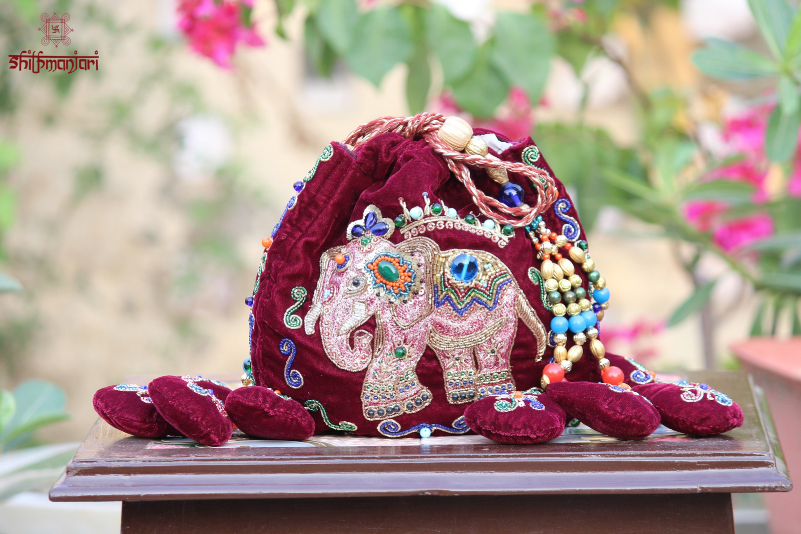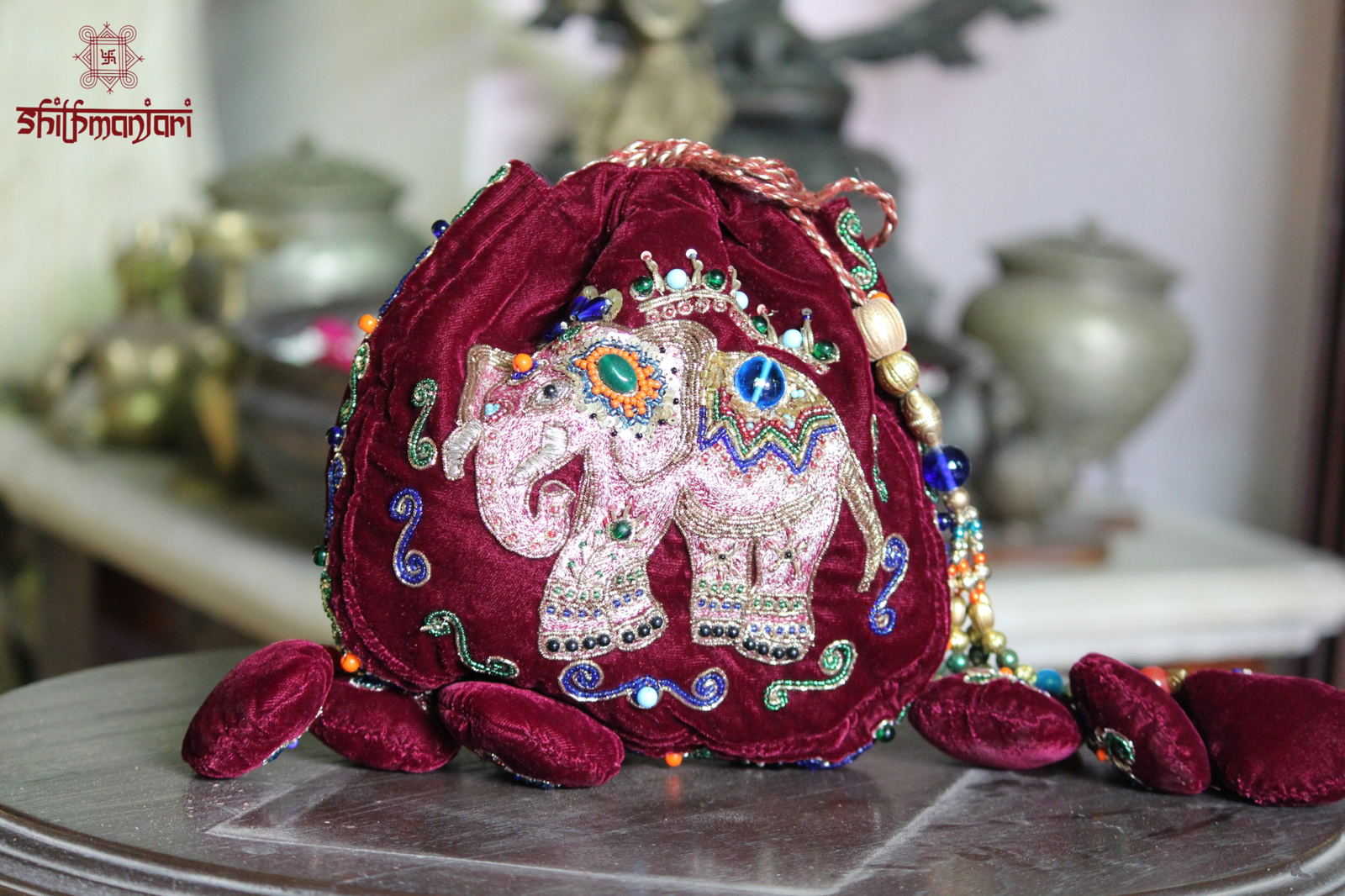Be the first to review “Royal Maroon Velvet Elephant Embroidered Potli Bag with Multicolor Bead & Stone Work (Designer Ethnic Clutch)”
