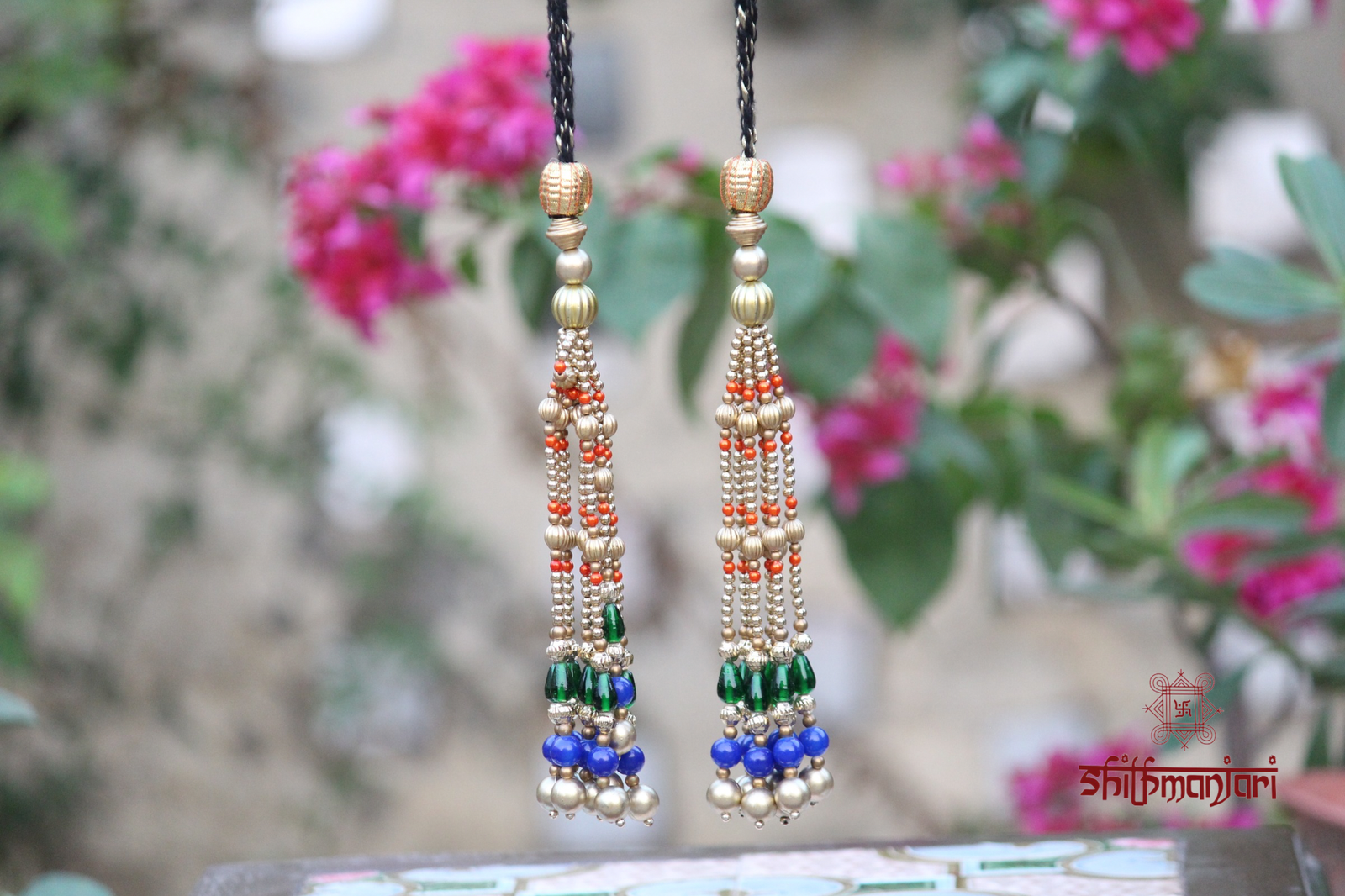 The Shahi Rangmahal Latkan Set with Multicolor Beaded Layers & Intricate Handcrafted Tassels (Luxury Ethnic Accessory) is a masterpiece that beautifully captures the essence of royal Indian craftsmanship. Designed with a harmonious blend of vibrant multicolor beads, this latkan set features cascading layered strands that create a rich, graceful movement with every step. The finely detailed handcrafted tassels add depth and elegance, making it a true statement piece.